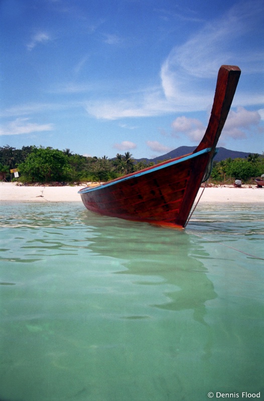 A traditional Thai longtail boat floats in pristine water just off a beautiful white sand beach in southern Thailand.
